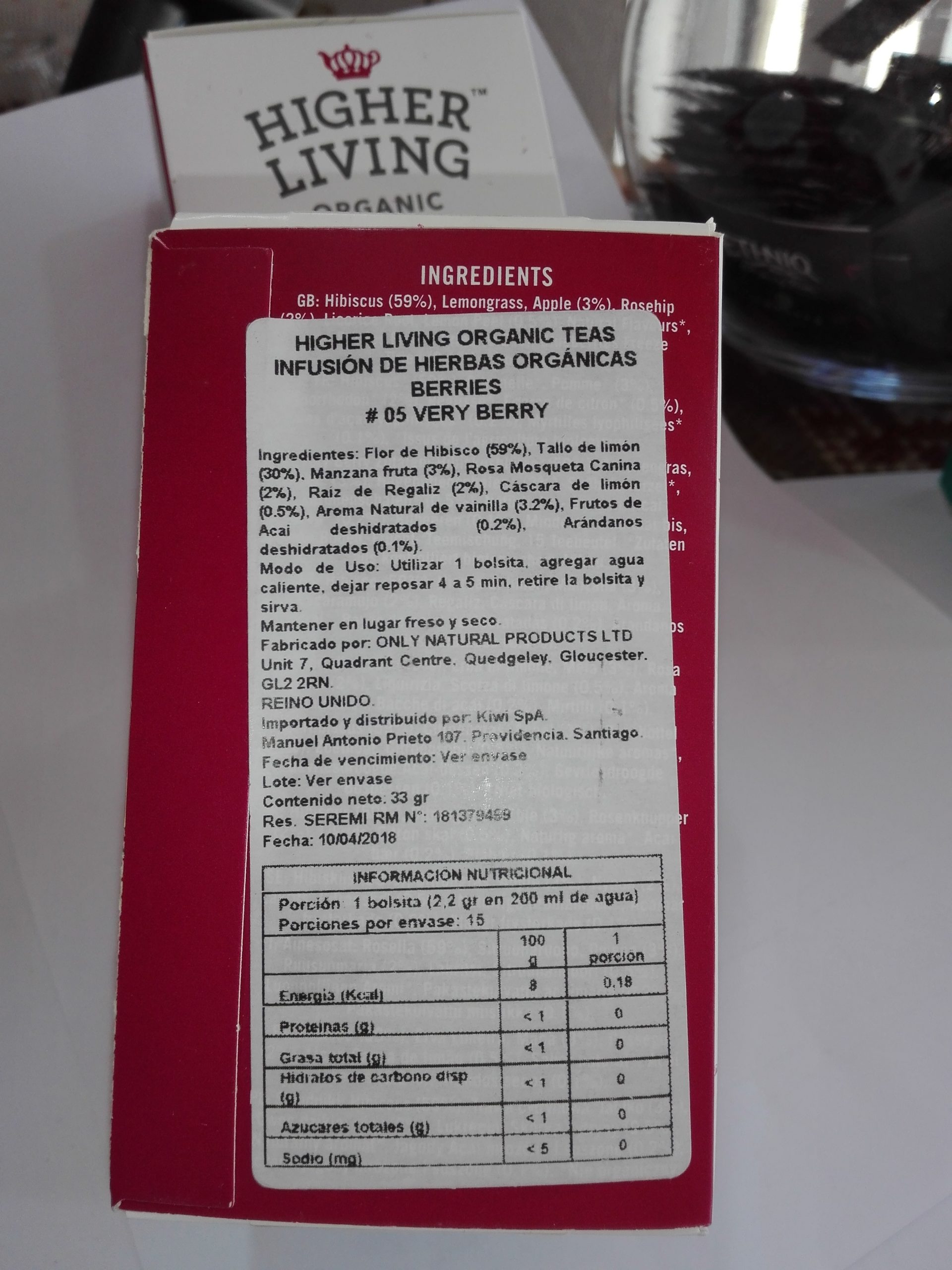 Hibisco (59%), hierba de limón, manzana (3%), rosa mosqueta (2%), raíz de regaliz, piel de limón (0,5%), sabores naturales *, bayas de acai liofilizadas (0,2%), arándanos liofilizados (0,1%) . *Inorgánico